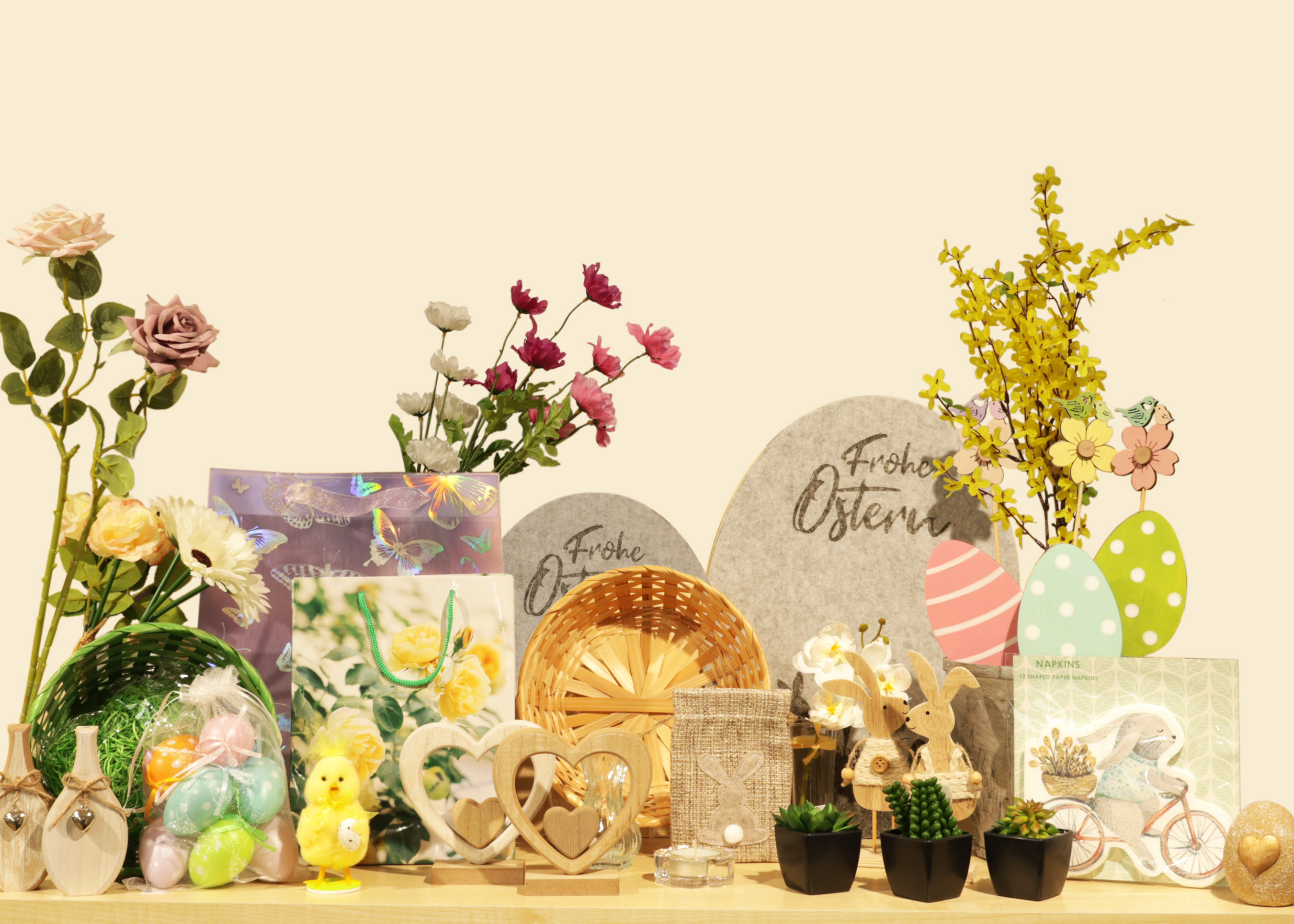 Beachten Sie unser Oster & Frühjahrssortiment 2026. Wir bieten Ihnen über 300 Kleinpreis- und Aktionsartikel aus den Bereichen Trendartikel, Dekoration, Geschenkzubehör und Give Away's aus allen Preislagen. Lassen Sie sich gleich hier im Online-Shop inspirieren.
