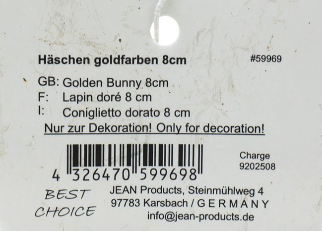Lapin doré, 8,1 x 4,8 cm, fabriqué et peint à la main en